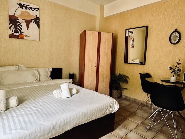 Cozy studio comes with a well-equipped kitchen with fridge, mini oven, stove, electric kettle, and a bathroom with shower.